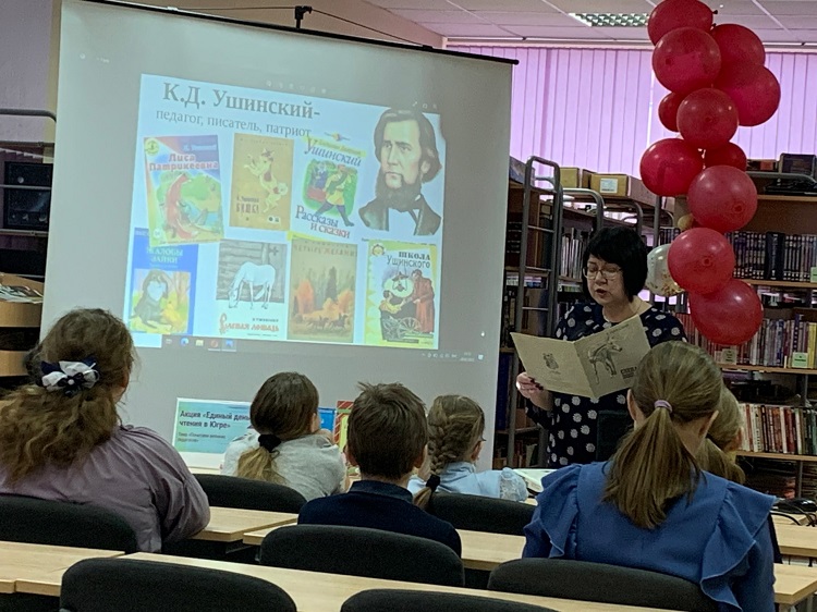 Салымская поселенческая модельная библиотека им. А. С. Тарханова для участия в акции пригласила учащихся 3-А класса Салымской СОШ № 1. С помощью презентации ребята познакомились с биографией и творчеством писателя, педагога – Константина Дмитриевича Ушинского.