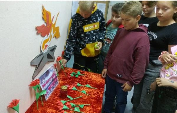 В этот день ребятам пришлось немало потрудиться. Под руководством библиотекаря они изготовили из цветной бумаги красные гвоздики и возложили их к импровизированному вечному огню.