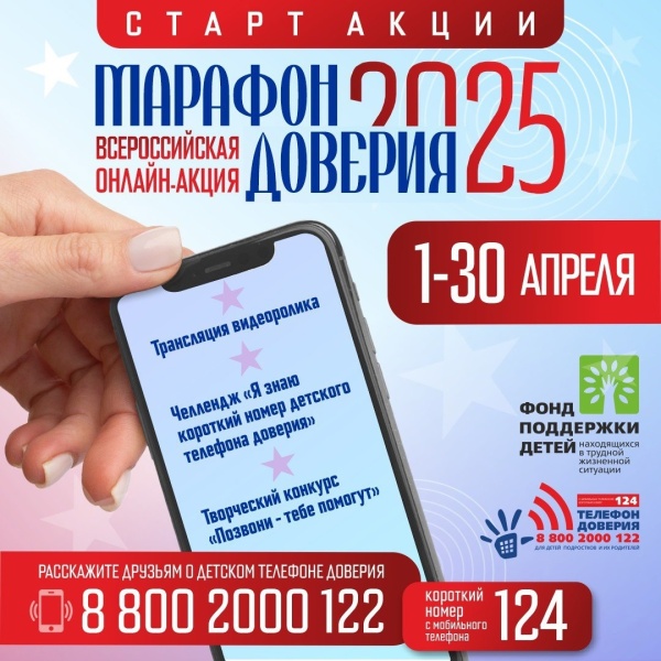 В 2025 году Фонд поддержки детей, находящихся в трудной жизненной ситуации, в партнерстве с Министерством семьи, труда и социальной защиты населения Республики Башкортостан проводит Всероссийскую онлайн-акцию «Марафон доверия. 2025», приуроченную к Международному дню детского телефона доверия (17 мая).