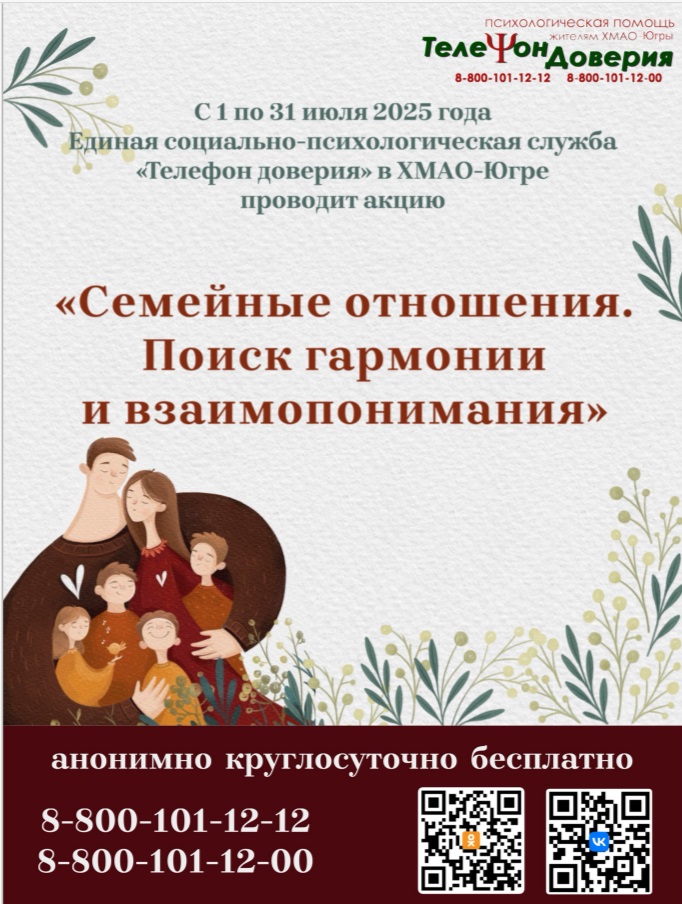 с 1 по 31 июля Единая социально-психологическая служба «Телефон доверия» в Ханты-Мансийском автономном округе – Югре проводит акцию «Семейные отношения. Поиск гармонии и взаимопонимания»
