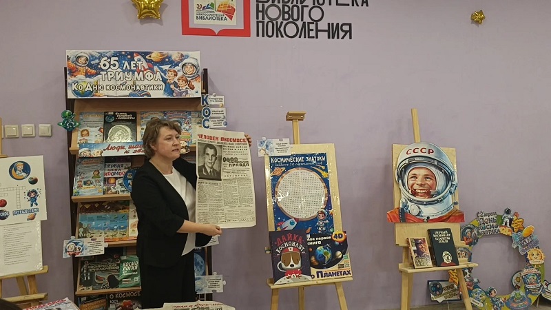 С восторгом ребята рассматривали подлинную газету тех лет, сообщавшую о легендарном полете космонавта, и узнали много интересных фактов из его жизни, внимательно изучив книжную выставку, посвященную первому космонавту «65 лет триумфа»
