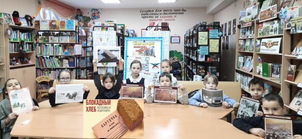 Библиотекарь рассказала юным читателям, как жил осаждённый город 872 дня, из чего пекли хлеб в условиях нехватки муки (целлюлоза, отруби, жмых, обойная пыль), почему «дорога жизни» через Ладогу стала спасением для тысяч людей, также познакомила с книгой С. Алексеева «Блокада Ленинграда» и прочитала рассказы «Блокадный хлеб», «Таня Савичева».