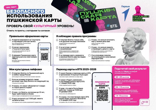 Уважаемые пользователи программы «Пушкинской карты»! Предлагаем вам проверить свой культурный уровень при помощи чек-листа, подготовленного Общероссийским общественно-государственным движением детей и молодежи «Движение первых».