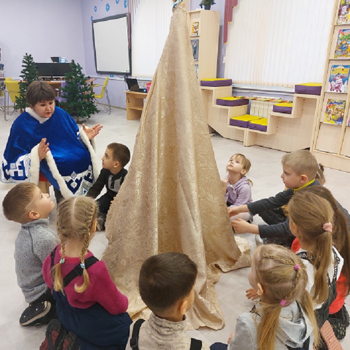 Библиотекарь познакомила дошкольников через просмотр презентации с коренными жителями ханты и манси, а также их национальной одеждой, традиционными промыслами, местом проживания и народными играми.