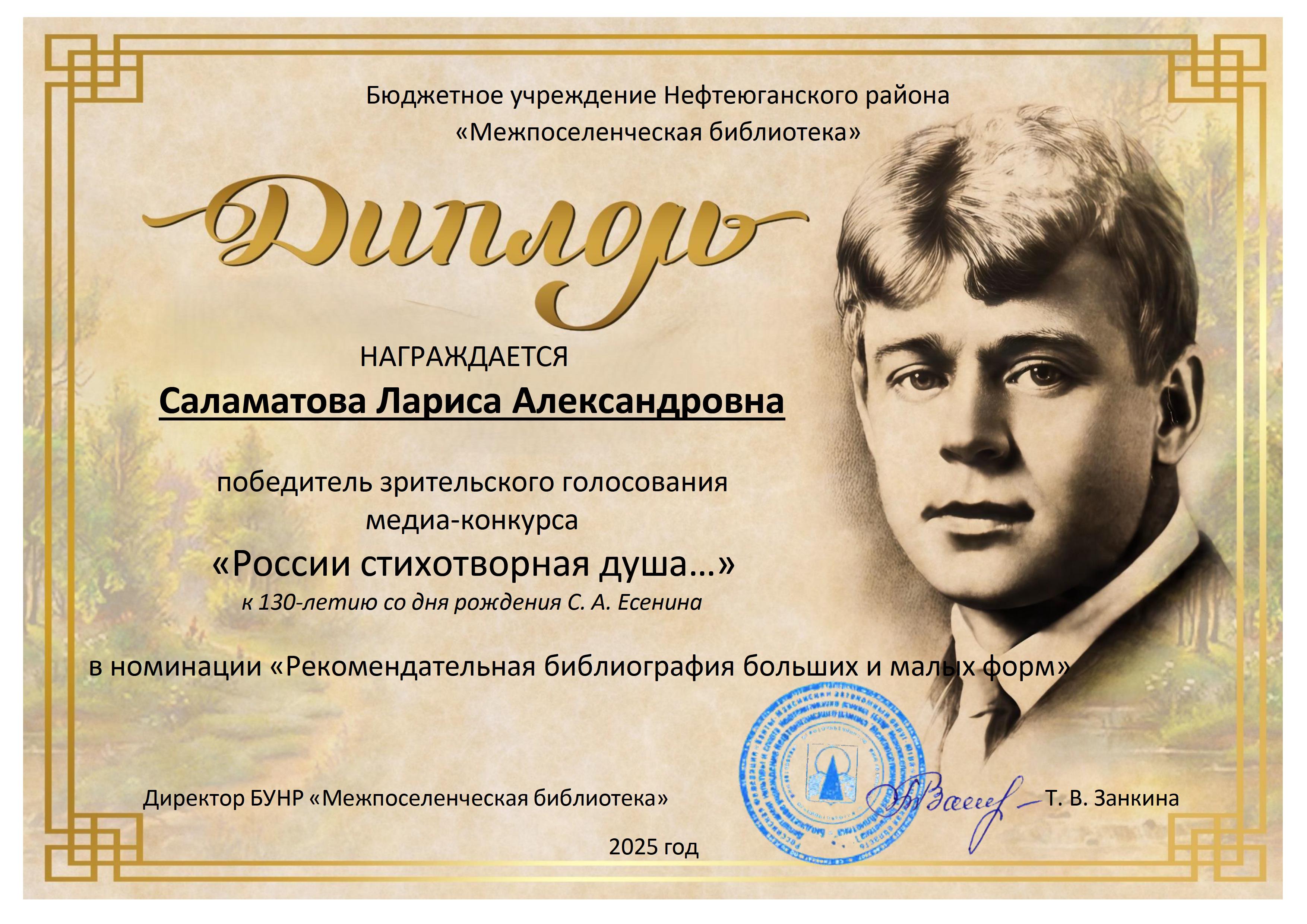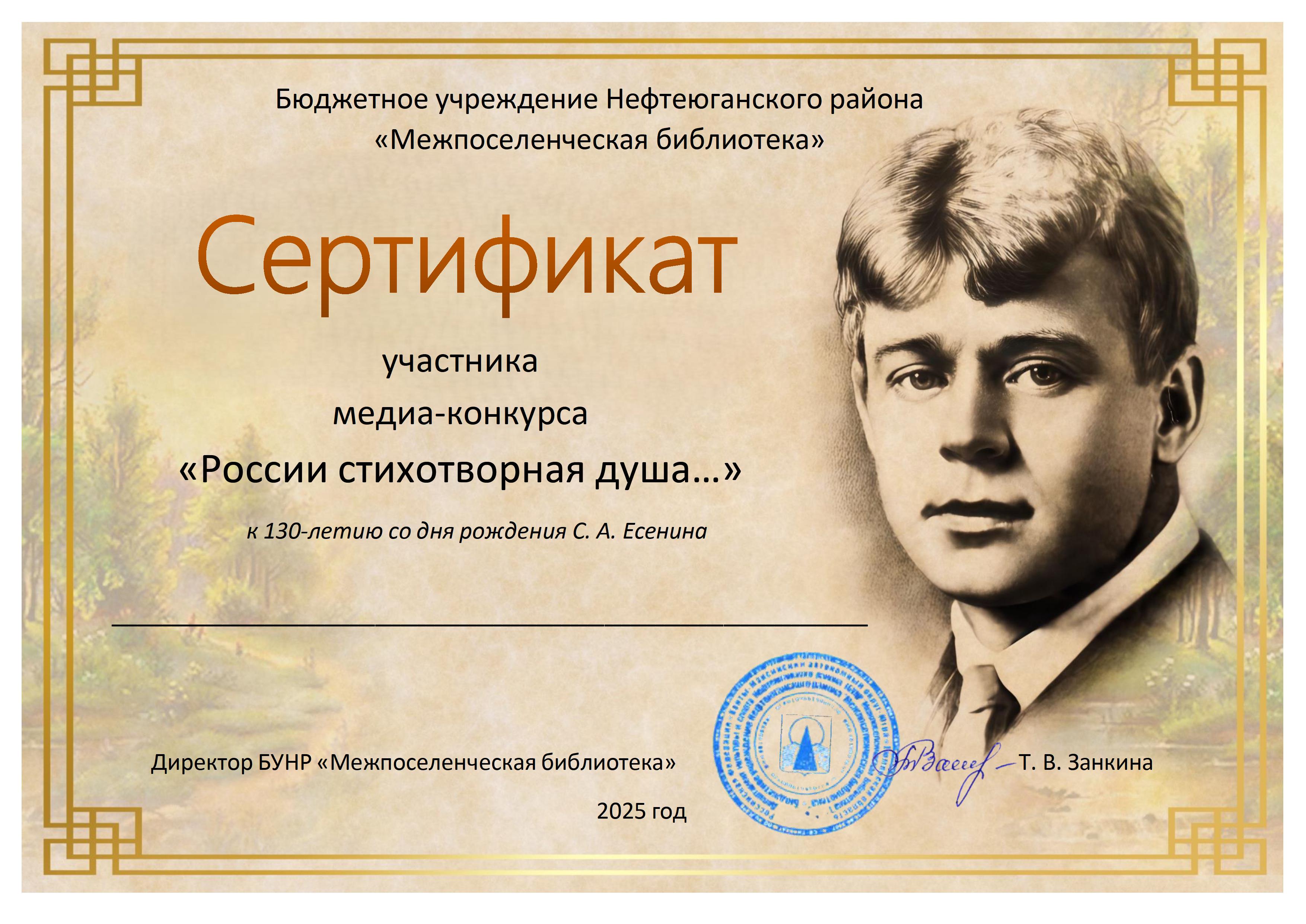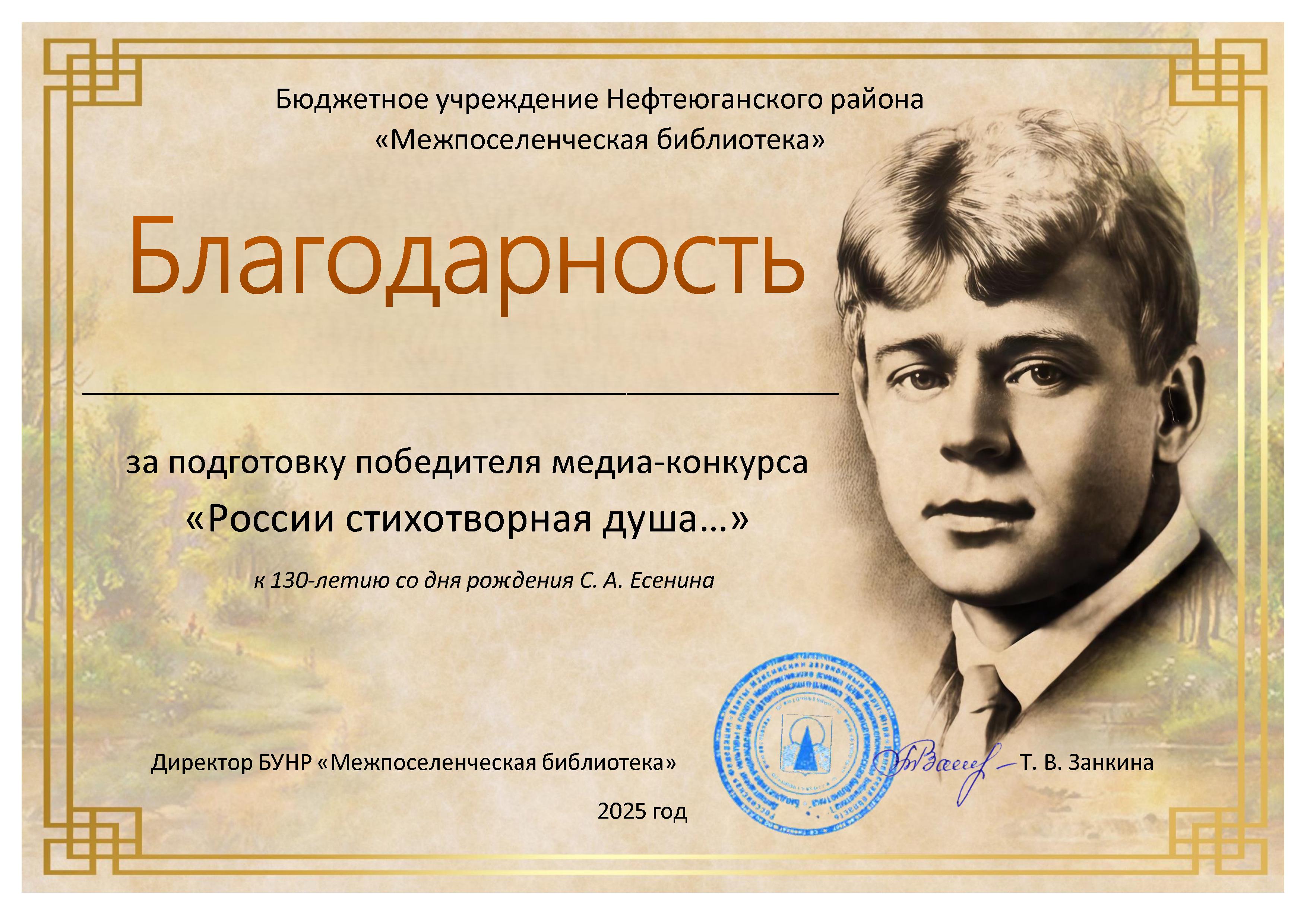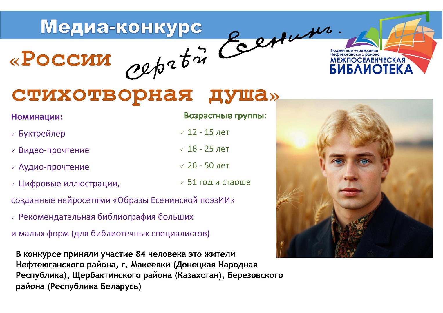 К юбилею великого русского поэта Сергея Александровича Есенина – одного из самых значимых деятелей русской литературы серебряного века Межпоселенческой библиотекой был организован медиа-конкурс «России стихотворная душа», который объединил любителей его творчества разных возрастов и профессий. Участники конкурса представили свои работы в номинациях: «Аудио-чтение», «Видео-прочтение» и «Цифровые иллюстрации, созданные нейросетями «Образы Есенинской поэзИИ», «Рекомендательная библиография больших и малых форм» (для библиотечных специалистов. Каждая работа была уникальной и показала, насколько глубоко участники прониклись творчеством поэта. Всего в конкурсе приняли участие 84 человека это жители Нефтеюганского района, г. Макеевки (Донецкая Народная Республика), Щербактинского района (Казахстан), Березовского района (Республика Беларусь).