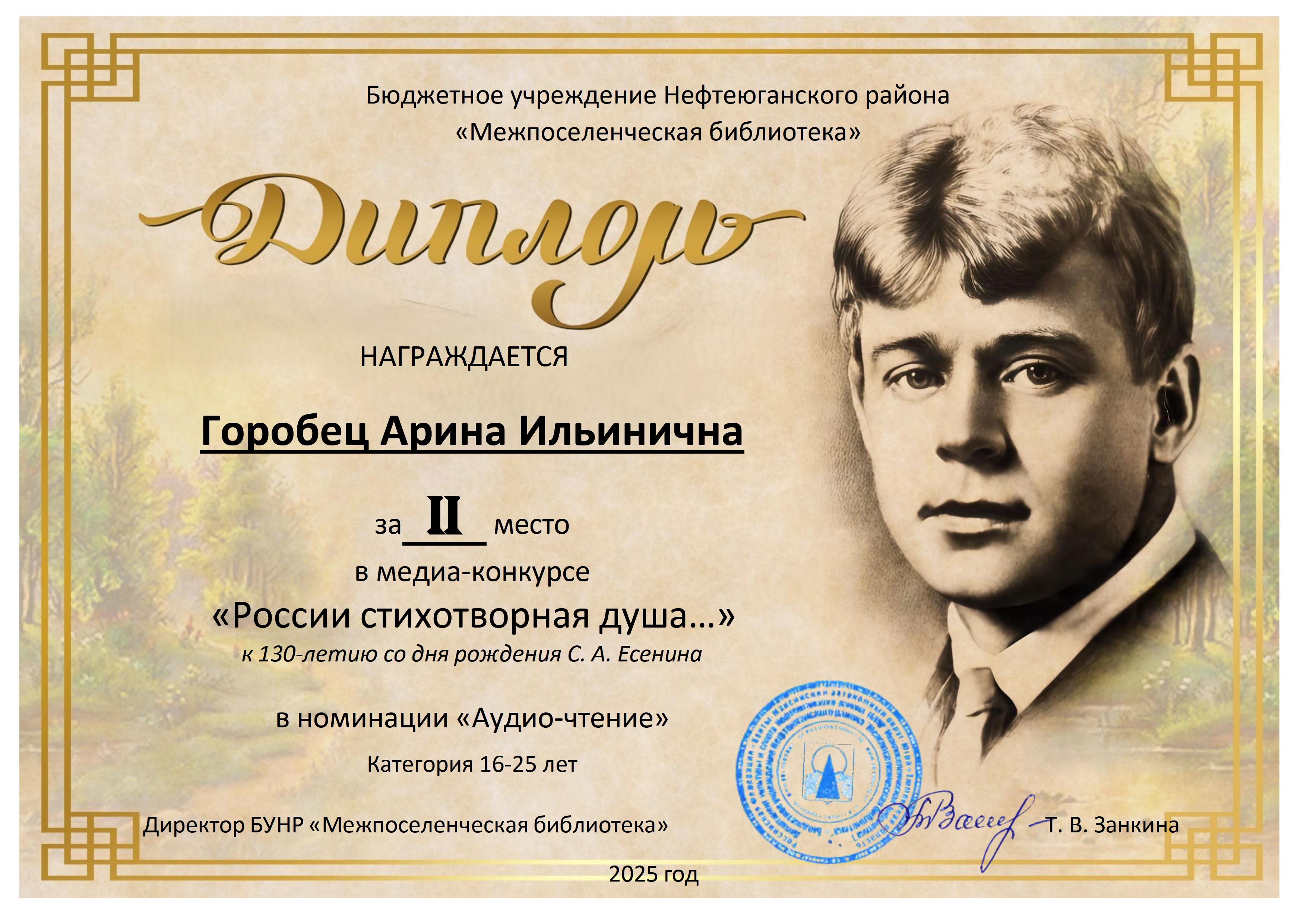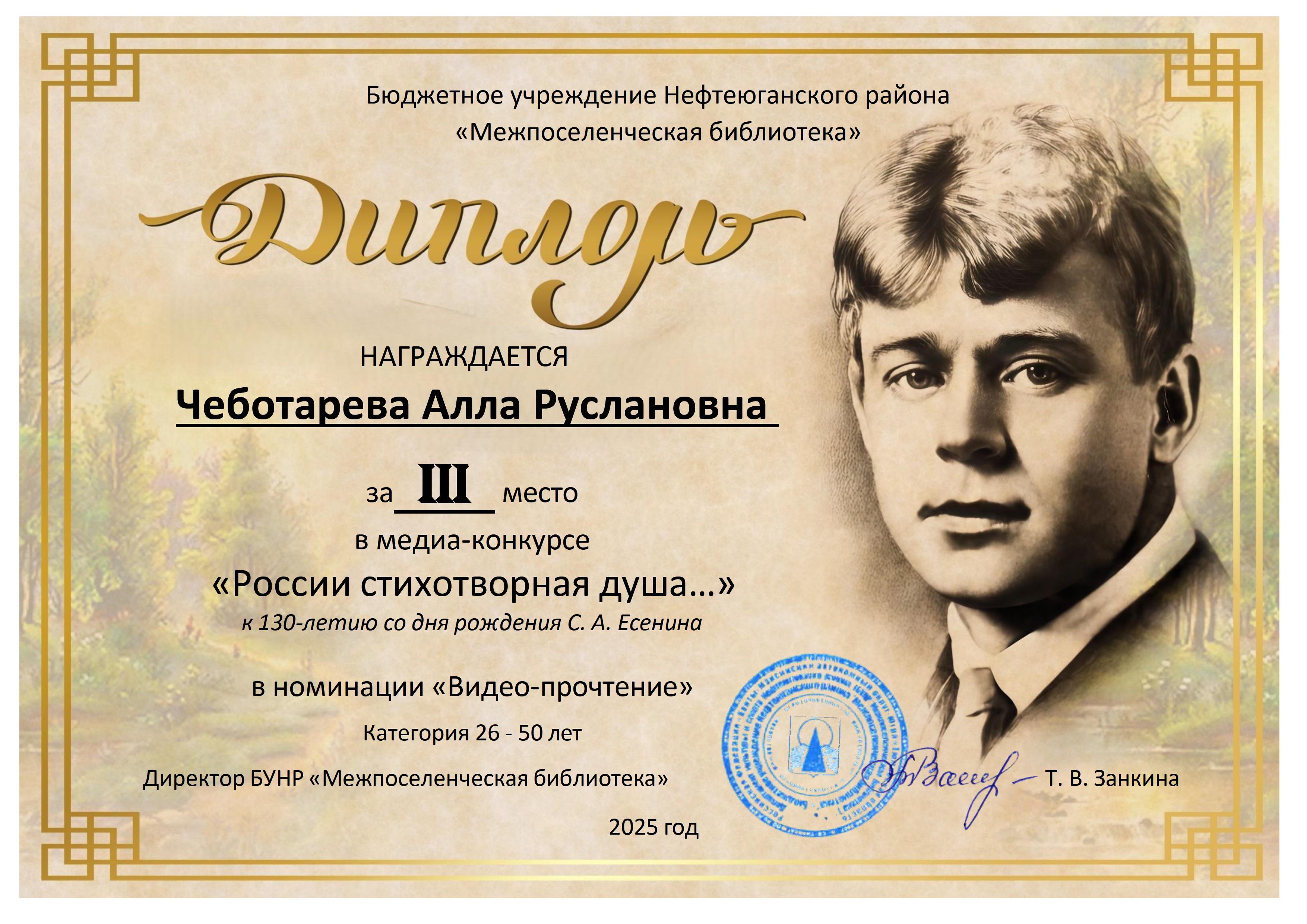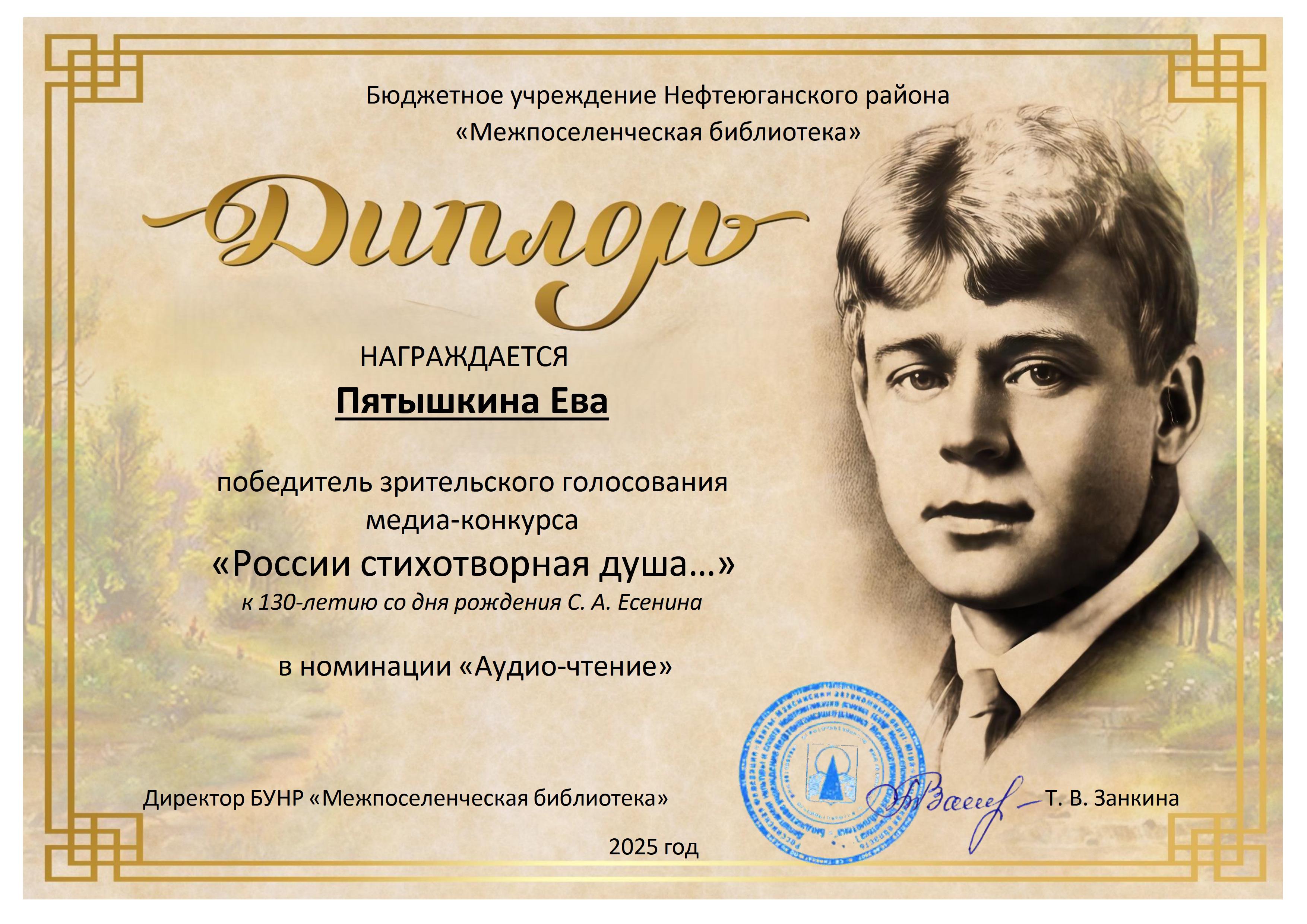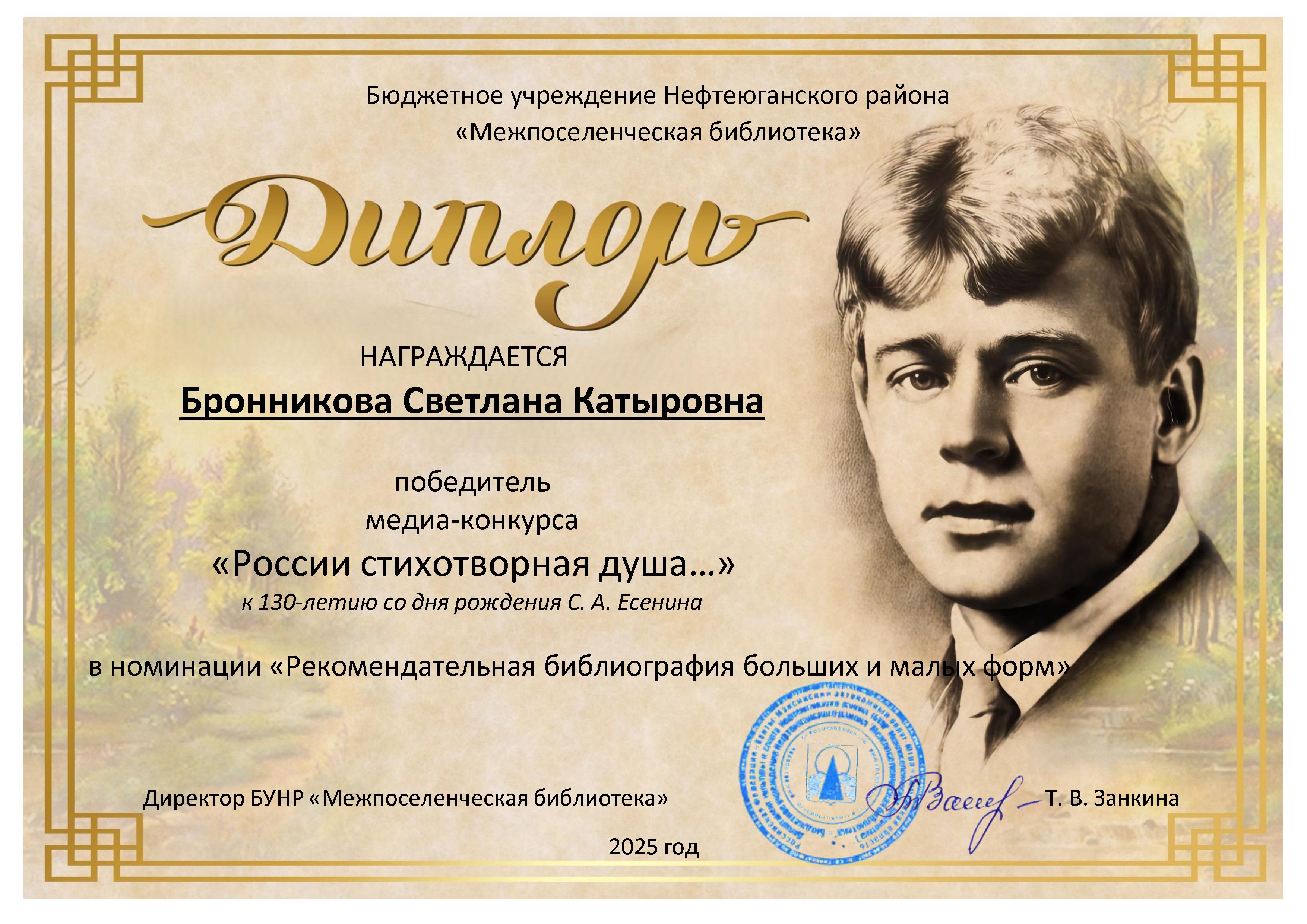 К юбилею великого русского поэта Сергея Александровича Есенина – одного из самых значимых деятелей русской литературы серебряного века Межпоселенческой библиотекой был организован медиа-конкурс «России стихотворная душа», который объединил любителей его творчества разных возрастов и профессий. Участники конкурса представили свои работы в номинациях: «Аудио-чтение», «Видео-прочтение» и «Цифровые иллюстрации, созданные нейросетями «Образы Есенинской поэзИИ», «Рекомендательная библиография больших и малых форм» (для библиотечных специалистов. Каждая работа была уникальной и показала, насколько глубоко участники прониклись творчеством поэта. Всего в конкурсе приняли участие 84 человека это жители Нефтеюганского района, г. Макеевки (Донецкая Народная Республика), Щербактинского района (Казахстан), Березовского района (Республика Беларусь).