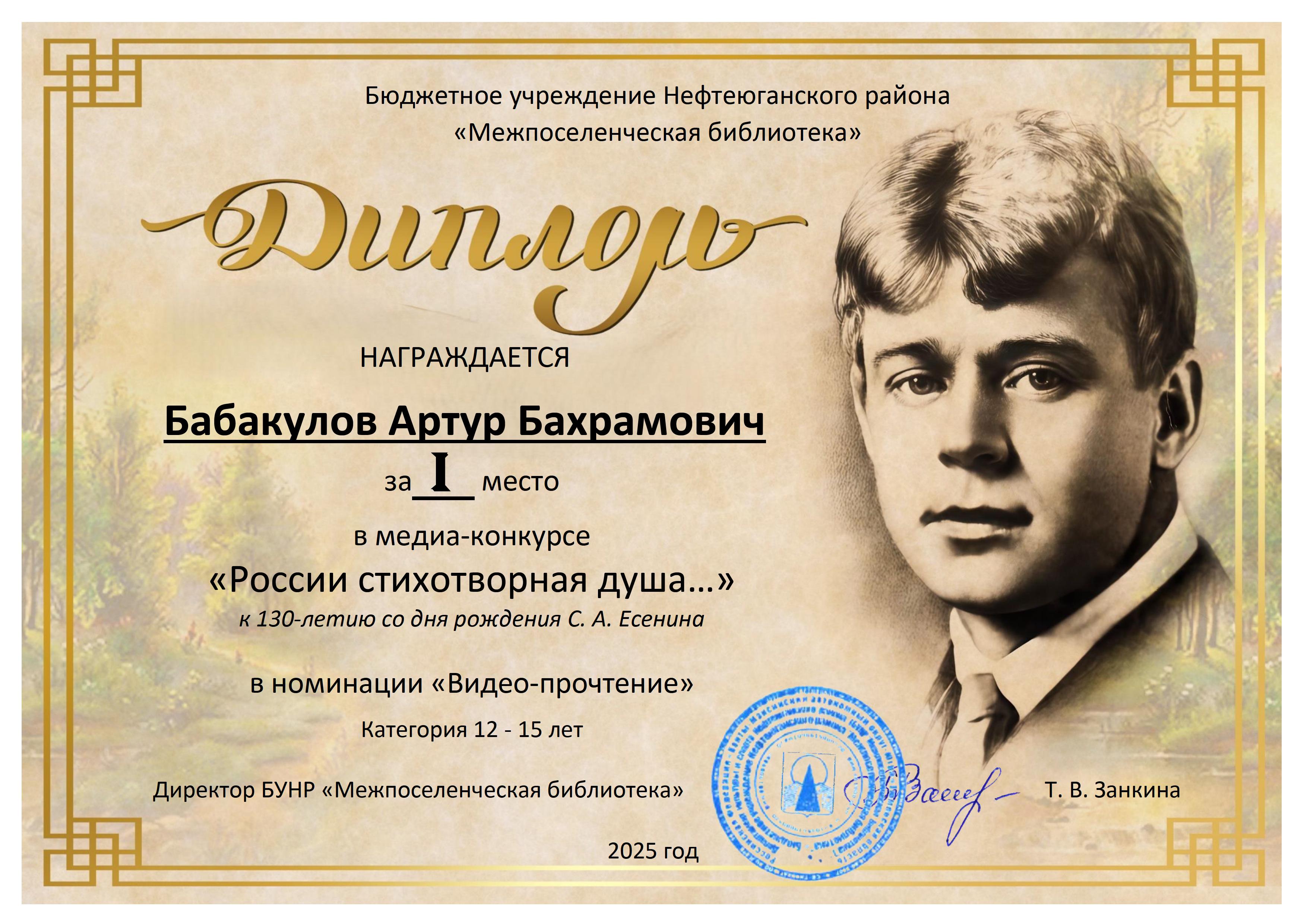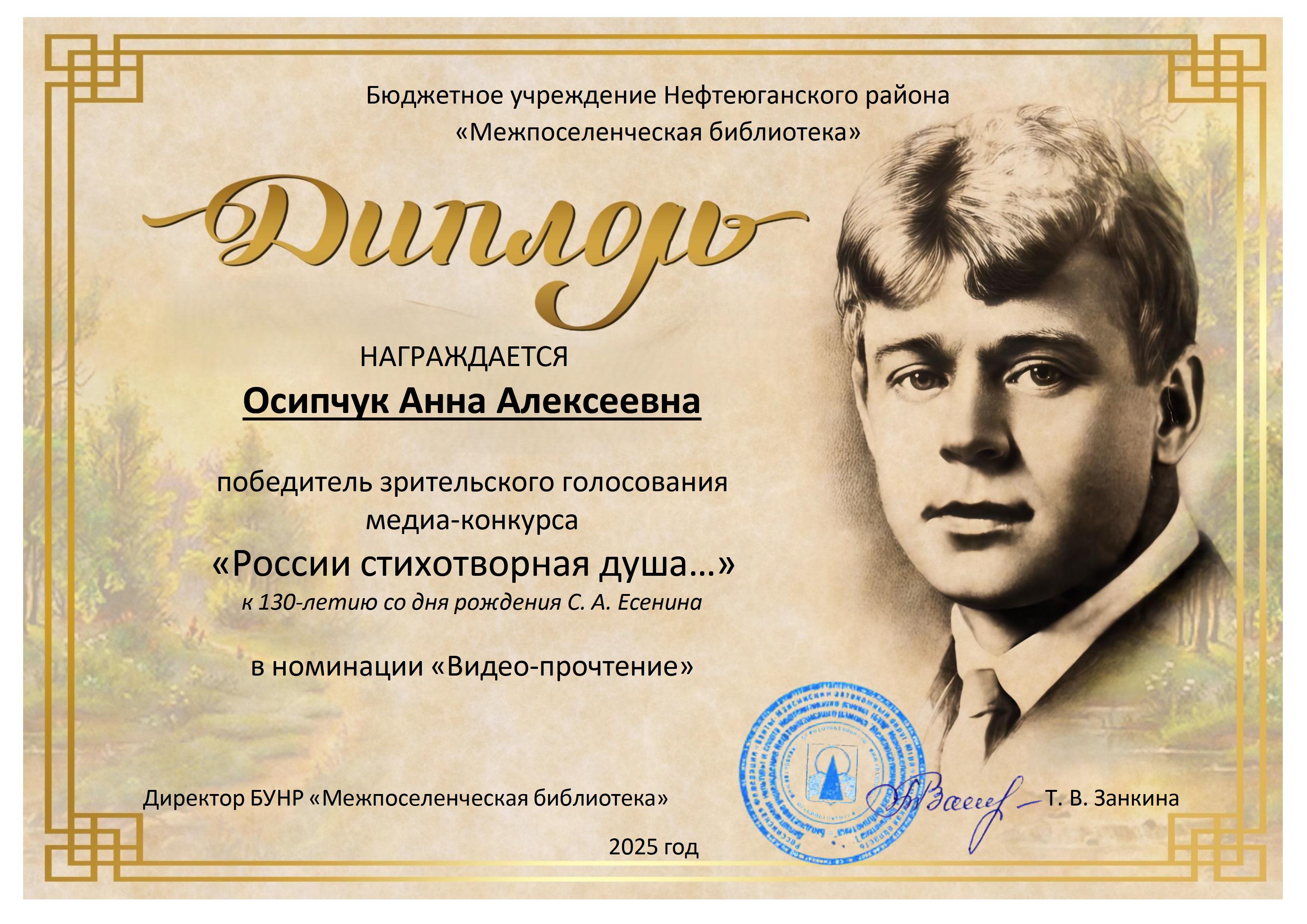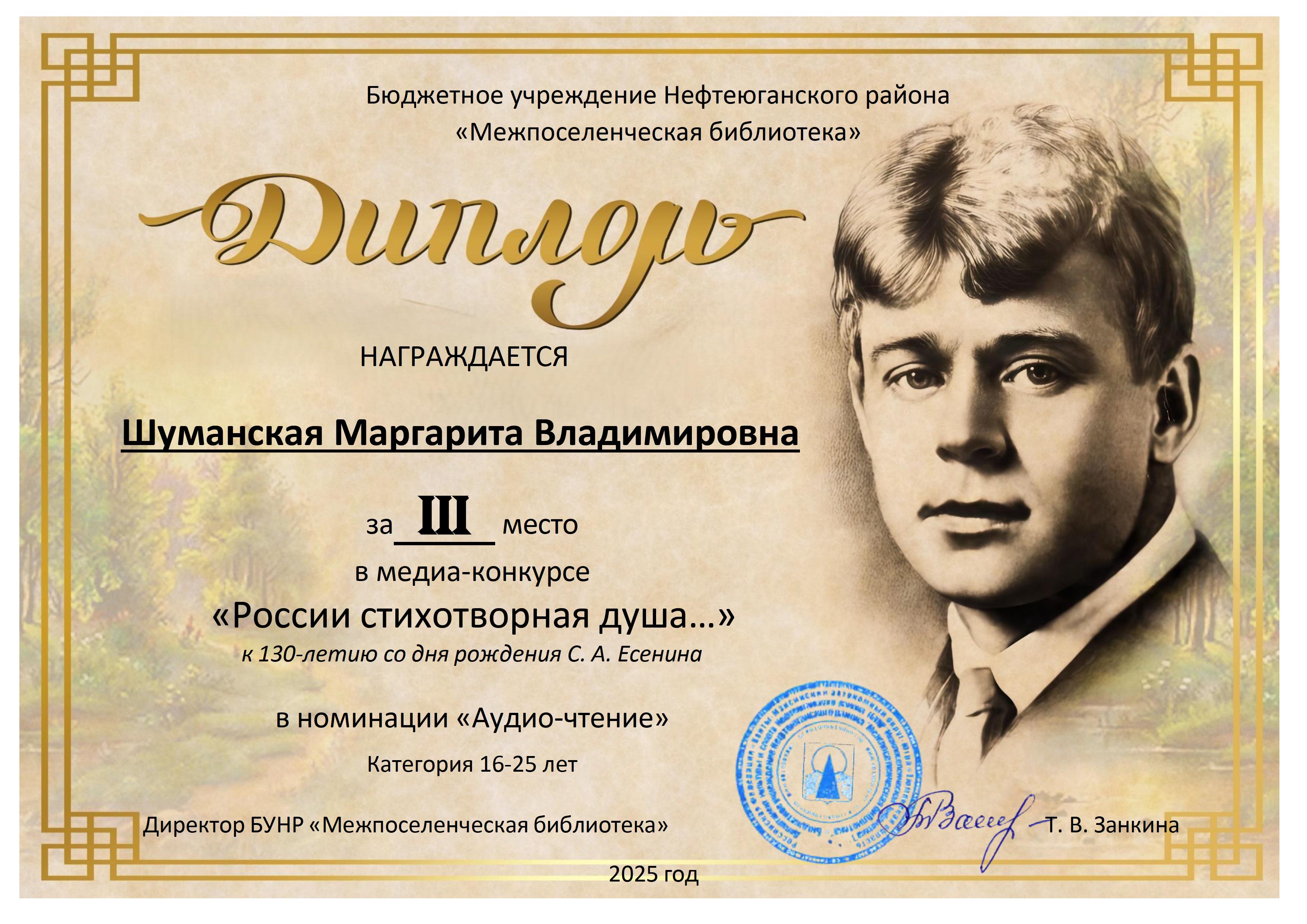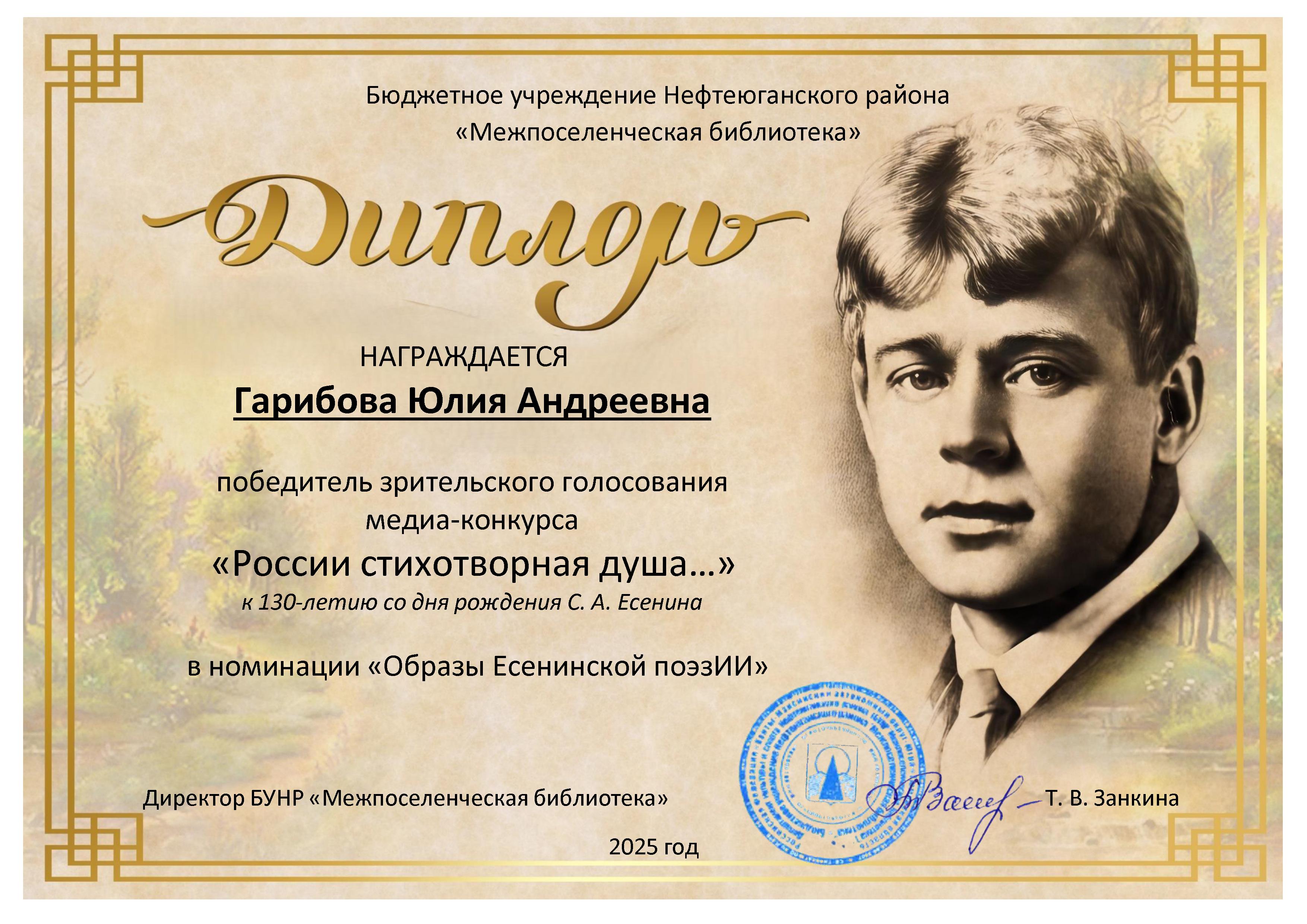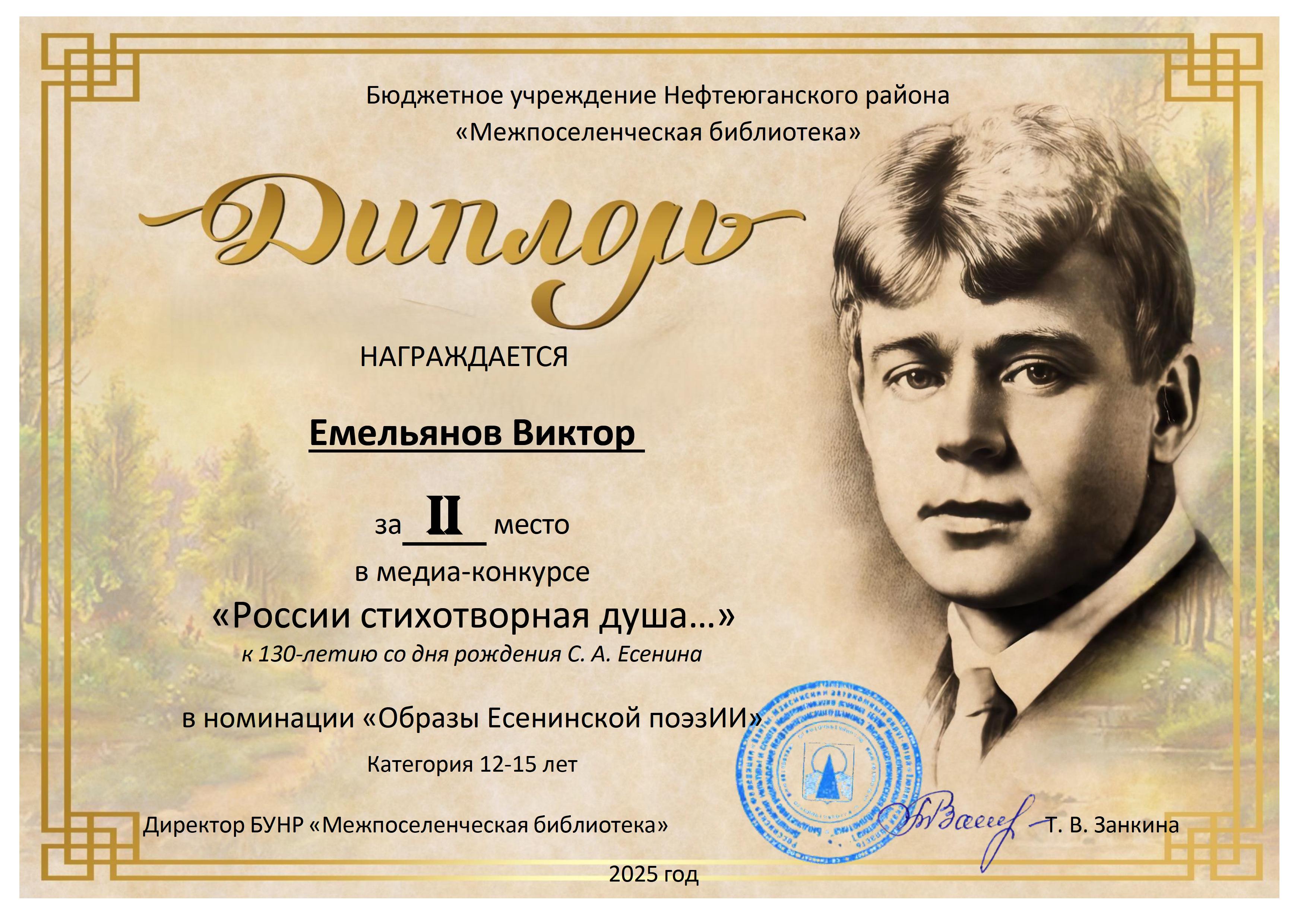К юбилею великого русского поэта Сергея Александровича Есенина – одного из самых значимых деятелей русской литературы серебряного века Межпоселенческой библиотекой был организован медиа-конкурс «России стихотворная душа», который объединил любителей его творчества разных возрастов и профессий. Участники конкурса представили свои работы в номинациях: «Аудио-чтение», «Видео-прочтение» и «Цифровые иллюстрации, созданные нейросетями «Образы Есенинской поэзИИ», «Рекомендательная библиография больших и малых форм» (для библиотечных специалистов. Каждая работа была уникальной и показала, насколько глубоко участники прониклись творчеством поэта. Всего в конкурсе приняли участие 84 человека это жители Нефтеюганского района, г. Макеевки (Донецкая Народная Республика), Щербактинского района (Казахстан), Березовского района (Республика Беларусь).