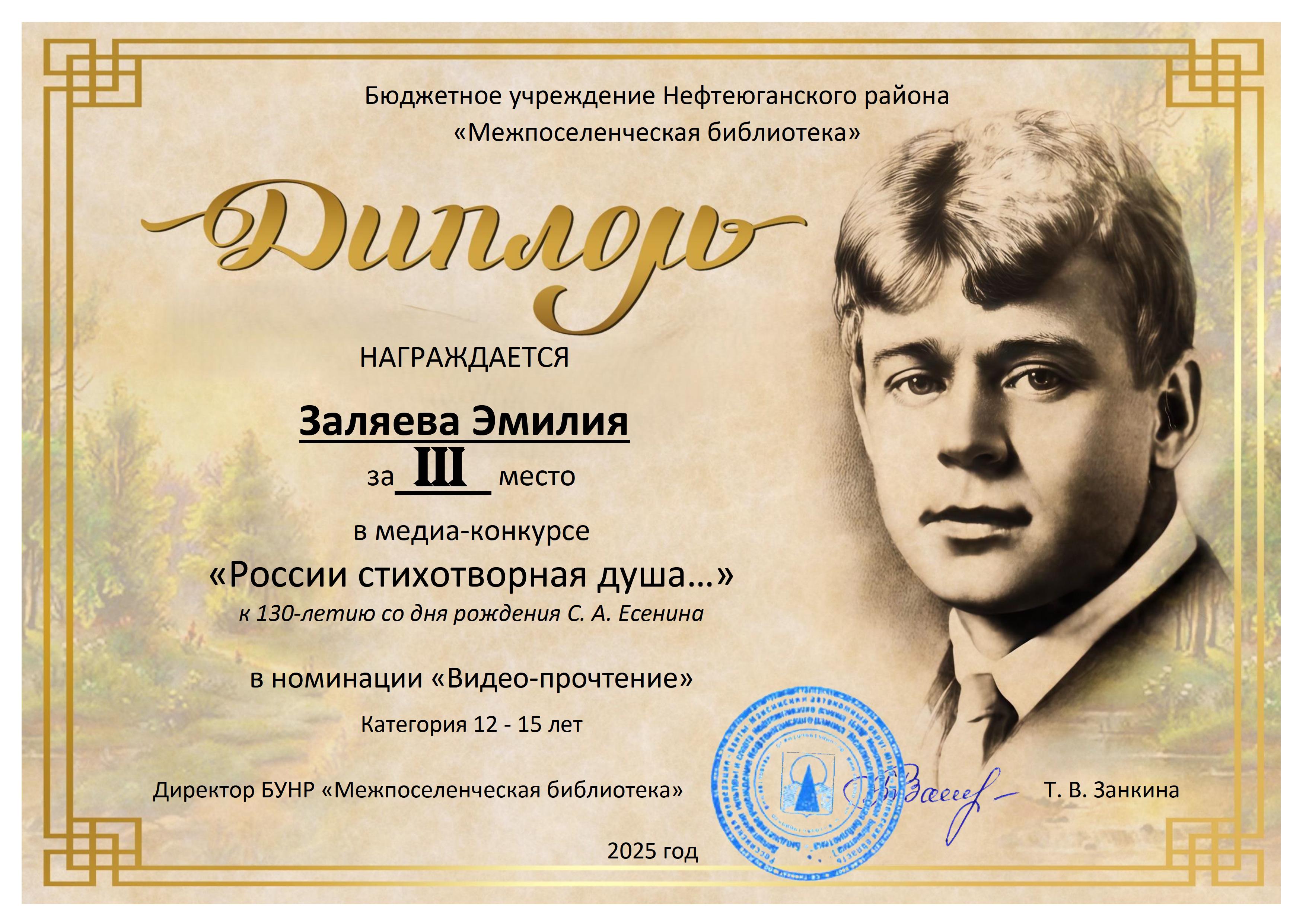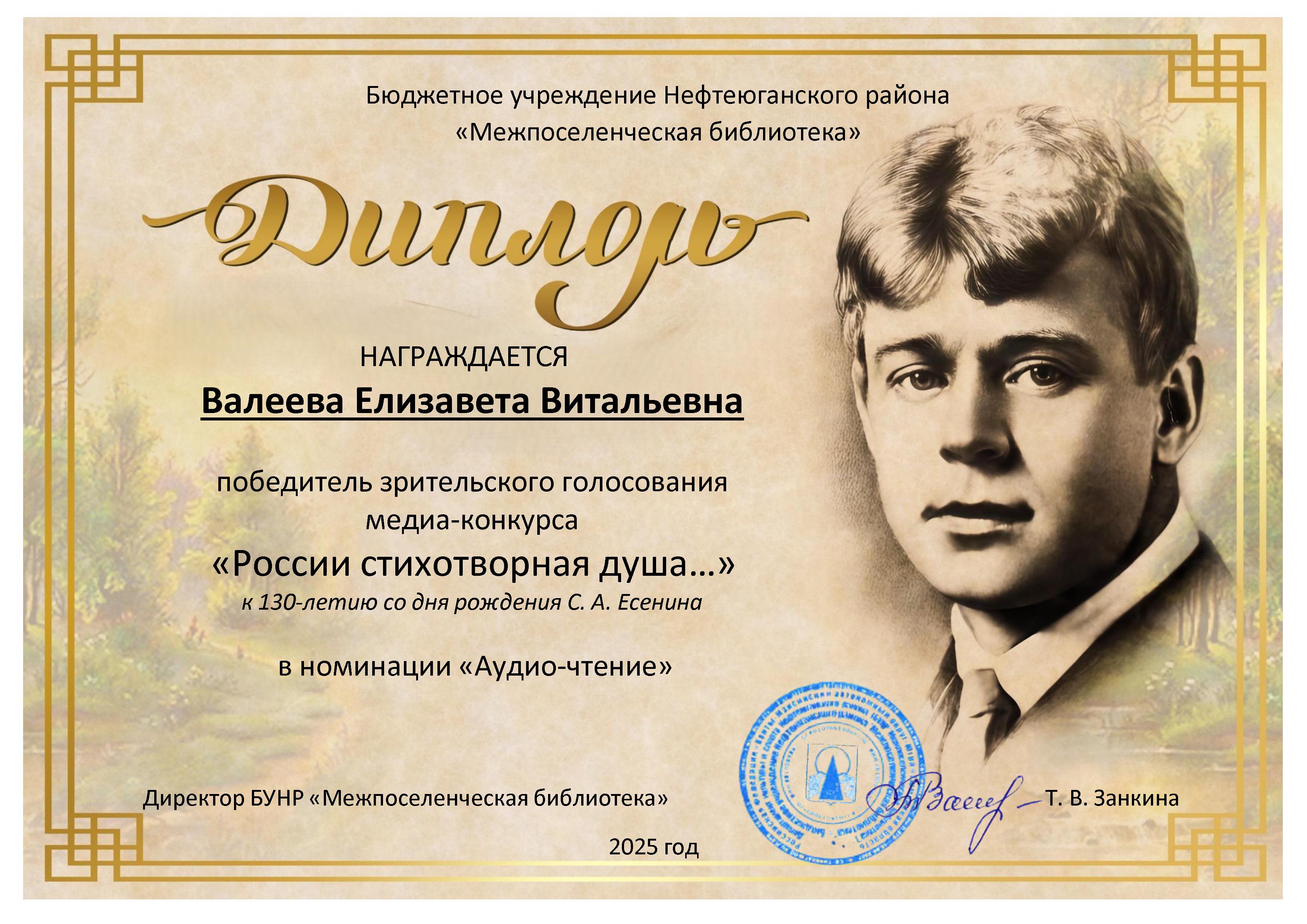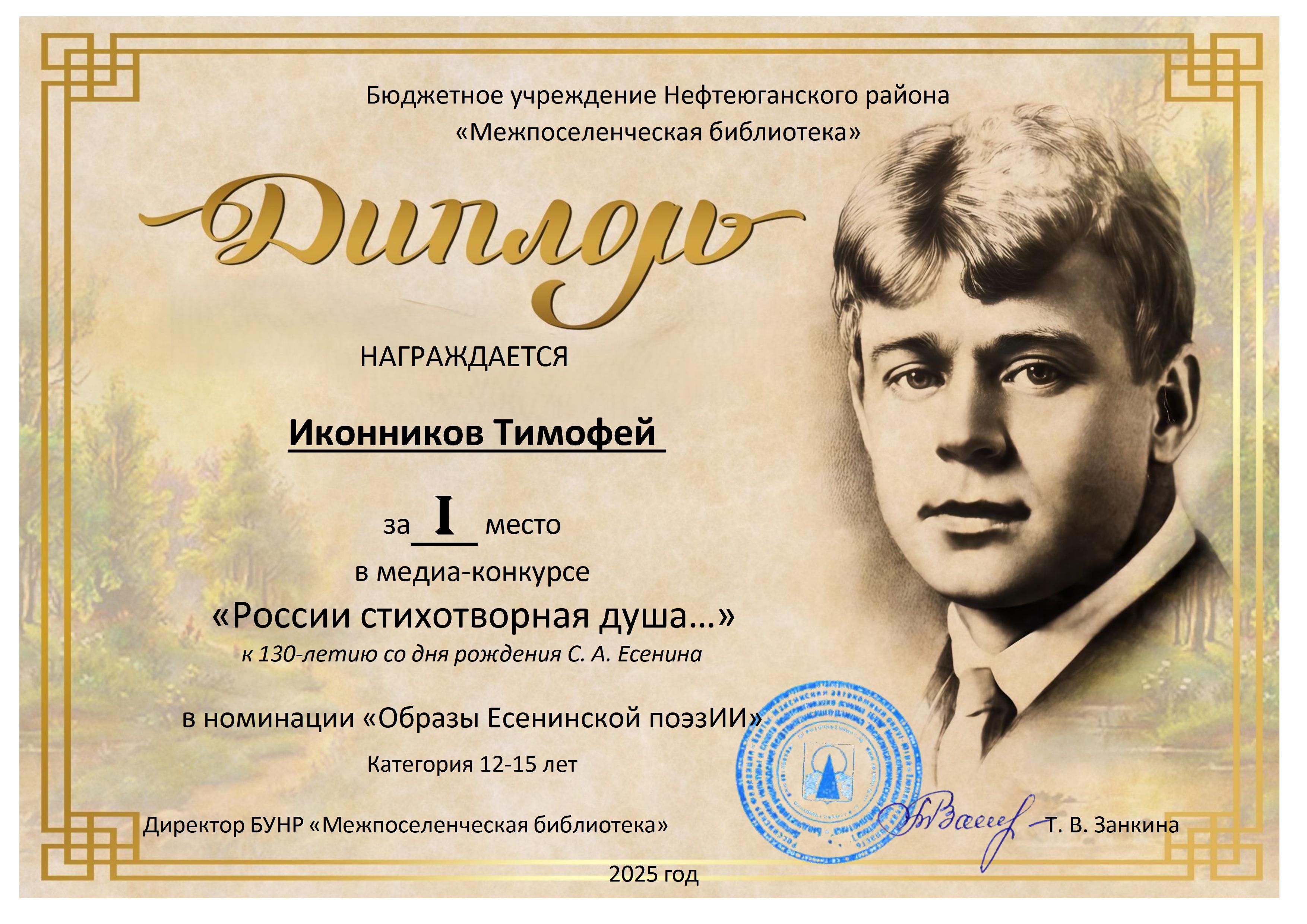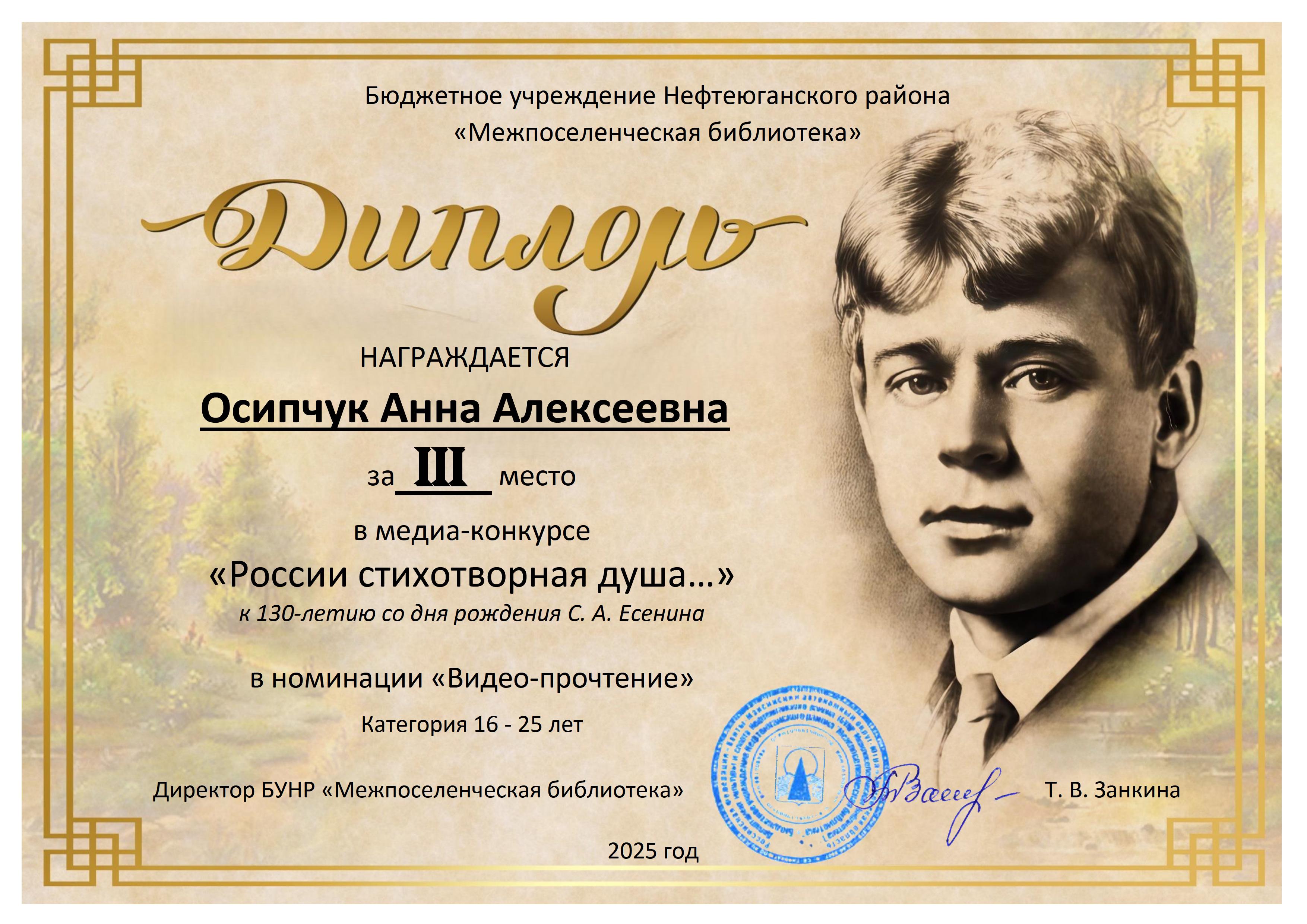 К юбилею великого русского поэта Сергея Александровича Есенина – одного из самых значимых деятелей русской литературы серебряного века Межпоселенческой библиотекой был организован медиа-конкурс «России стихотворная душа», который объединил любителей его творчества разных возрастов и профессий. Участники конкурса представили свои работы в номинациях: «Аудио-чтение», «Видео-прочтение» и «Цифровые иллюстрации, созданные нейросетями «Образы Есенинской поэзИИ», «Рекомендательная библиография больших и малых форм» (для библиотечных специалистов. Каждая работа была уникальной и показала, насколько глубоко участники прониклись творчеством поэта. Всего в конкурсе приняли участие 84 человека это жители Нефтеюганского района, г. Макеевки (Донецкая Народная Республика), Щербактинского района (Казахстан), Березовского района (Республика Беларусь).