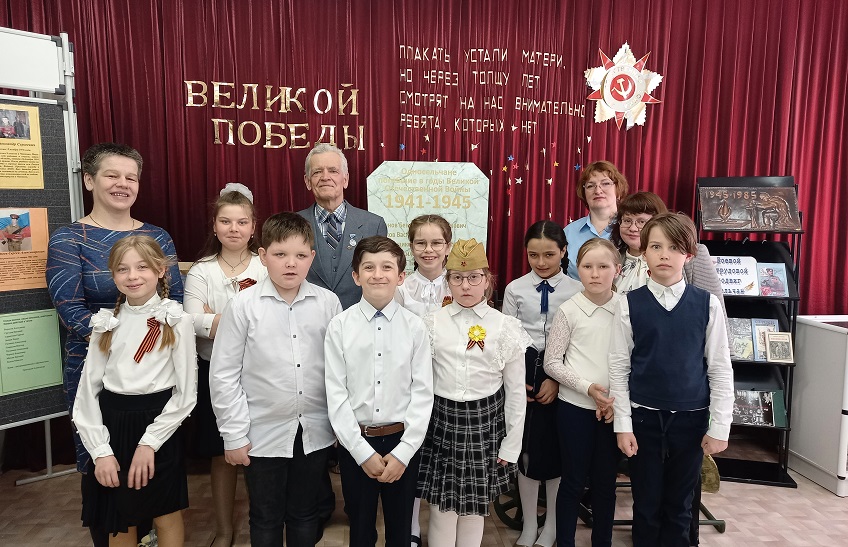 В мероприятии участвовал «ребенок войны», свидетель военных событий под Сталинградом Мясников Валерий Алексеевич. Он рассказал ребятам о своих детских воспоминаниях, как его семья участвовала в восстановлении Сталинграда после боев, об искореженных развалинах домов после бомбежек, о воронках от взрывов на берегу Волги, в одной из которых он чуть было, не утонул. Вспомнил Валерий Алексеевич об участвовавших в разборе завалов немецких военнопленных. Играя на улице и слыша немецкую речь, дети побаивались чужеземцев – завоевателей, потерпевших здесь поражение. Также Валерий Алексеевич рассказал, что помнит салюты в честь взятых Советской Армией городов и первый салют Победы в 1945 году. Школьники оживленно расспрашивали пожилого гостя о его жизни.