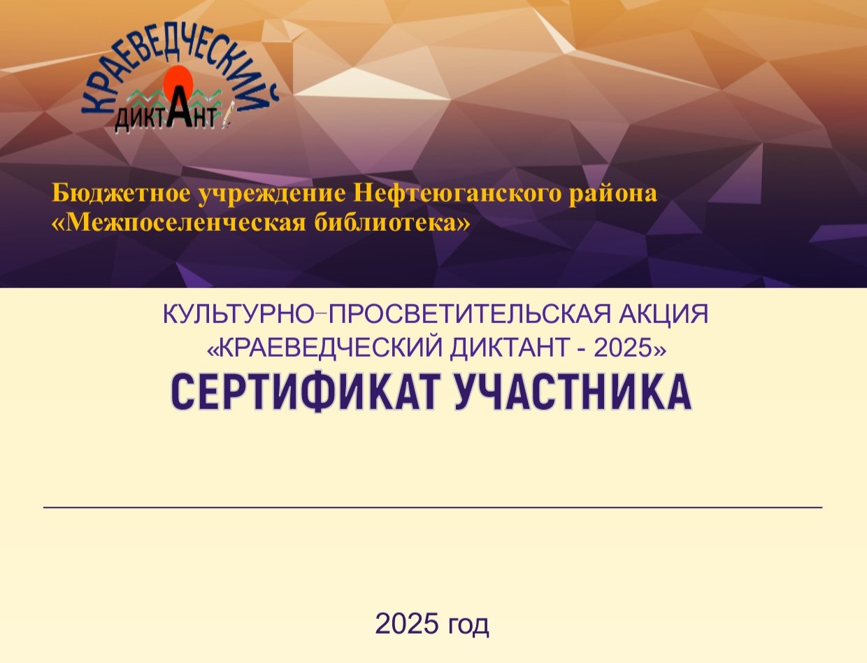 С 17 по 27 июня 2025 года пройдет культурно-просветительская акция – «Краеведческий диктант-2025». В этом году Диктант проводится в рамках празднования 45-летия Нефтеюганского района и 95-летия Ханты-Мансийского автономного округа – Югры.