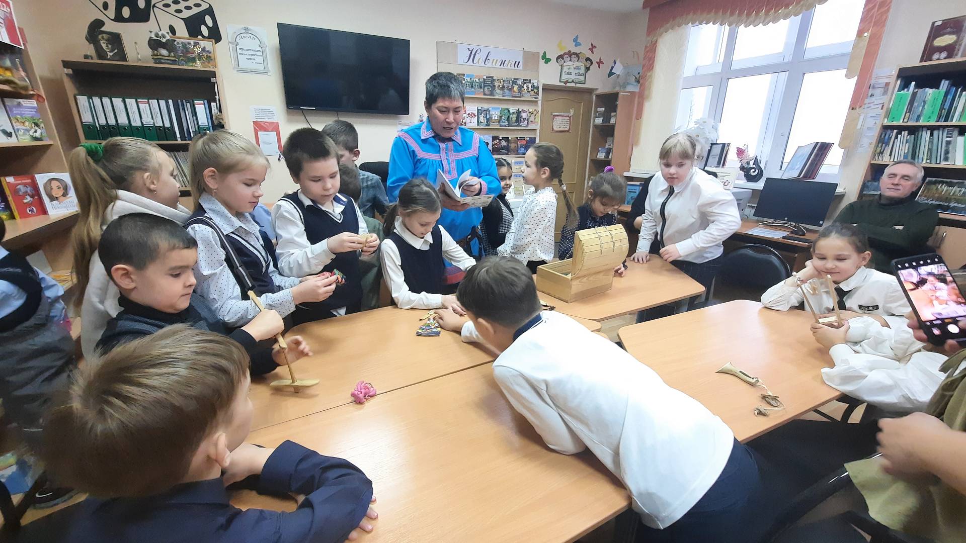 Писатель предложил ребятам отгадать несколько старинных загадок, в которых сплетались мудрость хантов и манси, образы тайги и рек, повадки зверей и тайны природы. Дети с азартом включались в игру: кто‑то мгновенно находил ответ, кто‑то размышлял, а кто‑то просил повторить загадку ещё раз. И вот — последняя отгадка прозвучала, и сундучок открылся! Внутри лежали традиционные детские игрушки народов ханты и манси: миниатюрные лодочки, маленькие куклы «Акань», которые помещаются в ладошку, различные головоломки для логики и развития мышления. Каждый предмет рассказывал свою историю — о том, как играли дети в стойбищах, какие сказки сопровождали их взросление, какие символы защищали и учили. Ребята с восторгом разглядывали находки, трогали их руками и пробовали разгадать головоломки.