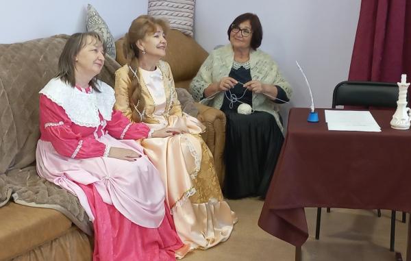 Театрализованная сценка по роману «Евгений Онегин», стала подарком для всех присутствующих. История отношения Евгения Онегина и Татьяны Лариной является одной из самых знаменитых любовных линий в русской литературе. Герои Татьяна Ларина, ее сестра Ольга, няня, Евгений Онегин за короткий промежуток времени позволили окунуться в атмосферу этого произведения. В прекрасном исполнении прозвучало письмо Татьяны к Онегину и Онегина к Татьяне.