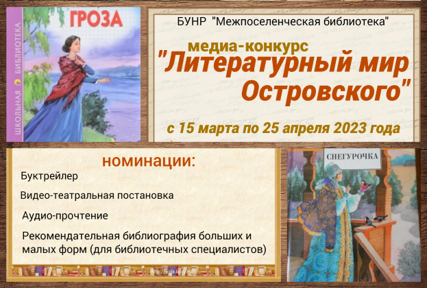 С 15 марта по 28 апреля 2023 года был проведен медиа-конкурс «Литературный мир Островского» к 200-летию Александра Николаевича Островского.