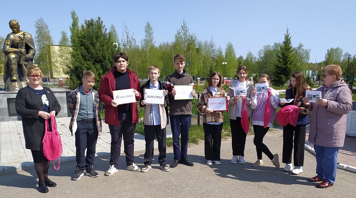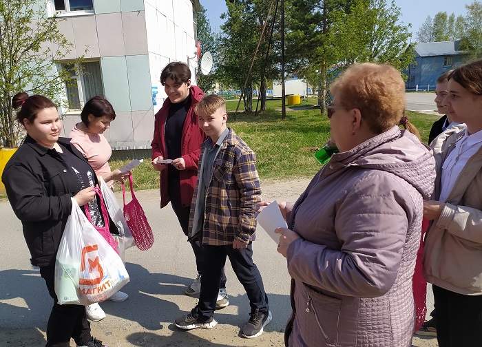 Мы прогулялись по улицам посёлка. Ребята рассказывали взрослым односельчанам о вреде, наносимом природе пакетами, вручали памятки с актуальной информацией и авоськи как альтернативу пакетам. Вручили авоськи и покупателям двух продуктовых магазинов.