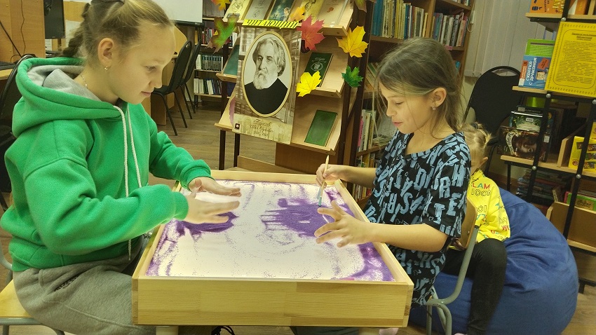 В Сентябрьской поселенческой библиотеке№1 у юных читателей есть много разных развлечений и занятий. Но мне хочется с вами поделится одним из самых любимым- это рисовать песком. Рисование песком отличается от классического рисования. Во-первых, у детей нет так называемого «страха белого листа», ведь лист изначально «грязный», да и даже если сделаешь не так, как хотел, все легко можно исправить. Во-вторых, в отличие от рисования на бумаге, тут не нужна резинка или запас чистой бумаги, чтоб исправить ошибку. Достаточно всего лишь разровнять песок — и можно начинать заново