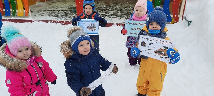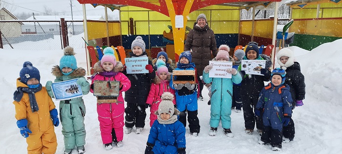 Ребятишки вместе с родителями заранее сделали кормушки для пернатых друзей. Маленькие участники мероприятия развесили птичьи кормушки на территории садика и с удовольствием наполнили их кормом. Затем ребята обратились ко всем неравнодушным людям с призывом «Покормите птиц»!