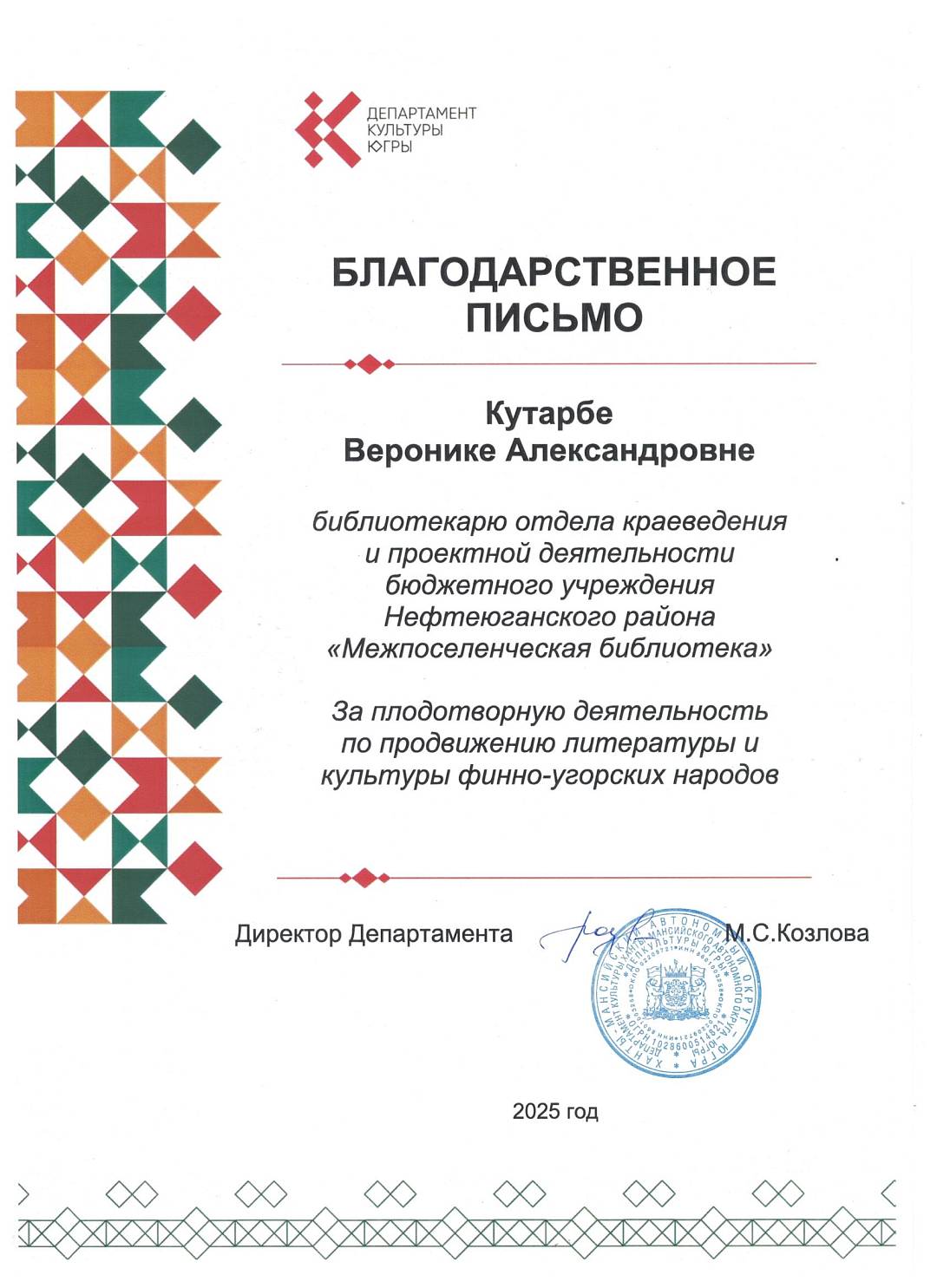 За плодотворную деятельность по продвижению литературы и культуры финно-угорских народов Благодарственные письма от Департамента культуры Югры получили сотрудники Межпоселенческой библиотеки – Миронов Виталий Александрович инженер-программист, сотрудники отдела краеведения и проектной деятельности – Нестерова Ирина Ивановна и Кутарба Вероника Александровна.