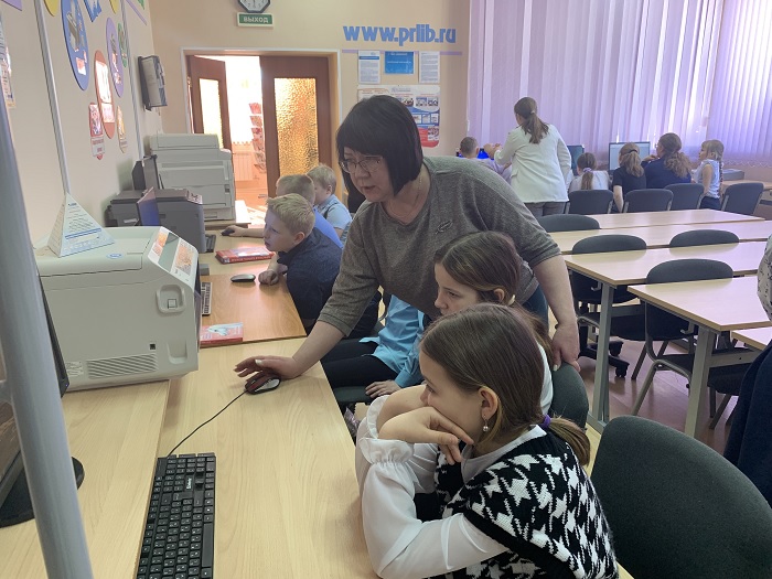 Затем учащиеся проследовали в читальный зал библиотеки. Познакомились с его работой. Самым интересным для ребят оказалась работа по созданию презентации. Учащиеся под руководством заведующей библиотеки попробовали сделать презентацию о детском писателе. «Это сколько же времени нужно библиотекарям, чтобы всё успеть!» - сказали ученики, попробовав себя в должности библиотекаря.