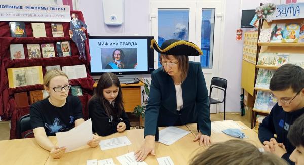 В Зале художественной литературы познакомились с выставкой «Военные реформы Петра I в художественной литературе». Задание, связанное с хронологией преобразований, преодолели с использованием полезных сайтов в интернете. Конкурс «МИФ или Правда» о Петре Великом, несомненно, пополнил копилку знаний школьников. Многое они только что изучили в рамках школьной программы, но не обошлось и без открытий.