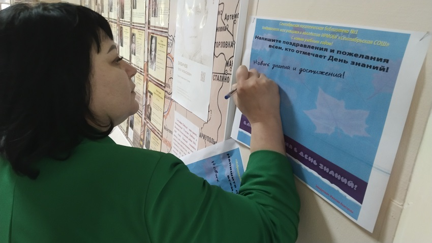 Сентябрьская поселенческая библиотека №1 провела акцию «Здравствуй, школа». Учащиеся и сотрудники школы писали пожелания и поздравления с новым учебным годом. Ребята старших классов писали напутственные слова первоклассникам, которые сегодня впервые сели за парты. Оформленная фотозона вызвала восторг не только у учащихся но и у родителей.