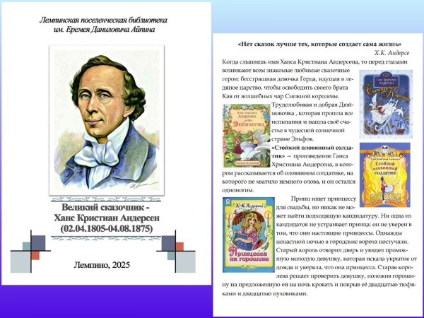 В 2025 году великому сказочнику Хансу-Кристиану Андерсену исполняется 220 лет. Бесчисленное множество стихотворений, более двадцати путевых очерков, пьесы, романы и свыше ста семидесяти сказок и историй. Таково литературное наследие выдающегося датчанина. Лемпинская ПБ им. Е.Д. Айпина разработала информационный буклет о жизни и творчестве Х.-К. Андерсена