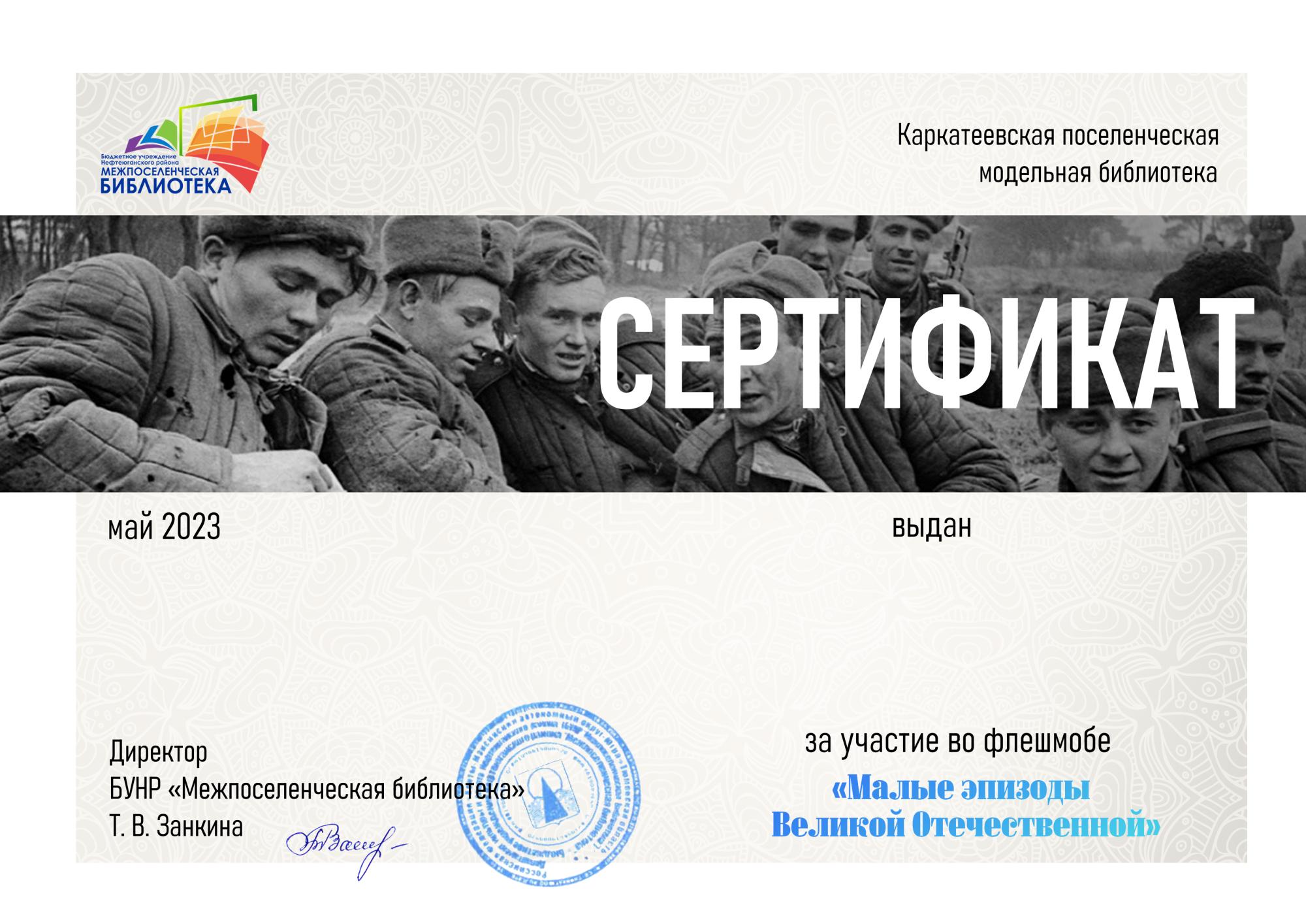 Каркатеевская поселенческая модельная библиотека предложила всем желающим принять участие в флешмобе «Малые эпизоды Великой Отечественной», в ходе которого следовало рассказать или зачитать отрывок из воспоминаний, публикаций о конкретных боях, случаях, происшествиях, буднях войны и тыла. В флешмобе приняли участие сотрудники и читатели библиотек Нефтеюганского района и библиотек-партнёров в рамках программы «Библиодружба» КГУ «Централизованная библиотечная система Щербактинского района» (Казахстан), КУ Культуры «Централизованная библиотечная система г. Макеевки» (ДНР) (более тридцати человек).