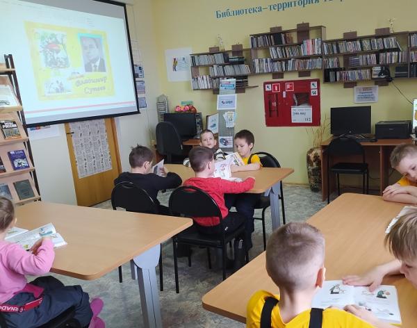 Каркатеевская поселенческая модельная библиотека продолжает реализовать программу «На пороге большого открытия». Участники программы – воспитанники подготовительной группы детского сада «Буратино». Очередное мероприятие программы было посвящено творчеству замечательного детского писателя и иллюстратора Владимира Григорьевича Сутеева. Сначала ребята познакомились с краткой биографией писателя: узнали, что Владимир Григорьевич начинал свою творческую деятельность как режиссер-мультипликатор, и сценарист. Сутеев считается одним из основателей советской мультипликации. Узнали интересный факт: писатель прекрасно владел правой и левой рукой, при этом одной мог писать, а другой – рисовать, такая способность называется амбидекстрия. С 1947 года сотрудничал с Детгизом: иллюстрировал множество детских сказок советских писателей. С середины 1950-х годов Владимир Сутеев писал детские книги и сам их иллюстрировал. Почти каждое предложение сопровождается иллюстрацией, в которые художник много привнёс из мультипликации: динамичные рисунки похожи на кадры мультфильмов. Иллюстрации В. Г. Сутеева часто используются для оформления детских садов, детских лечебных учреждений, столовых, магазинов. В настоящее время издаются также в виде открыток. А затем ребята слушали сказку «Мышонок и карандаш» и рисовали вслед за повествованием. Ребятам идея понравилась: они очень старались рисовать все части рисунка, и с интересом рассматривали весёлые, запоминающиеся иллюстрации В. Сутеева в его книгах. Наша очередная встреча способствовала творческому развитию ребят, расширению детского кругозора, позитивному восприятию мира.