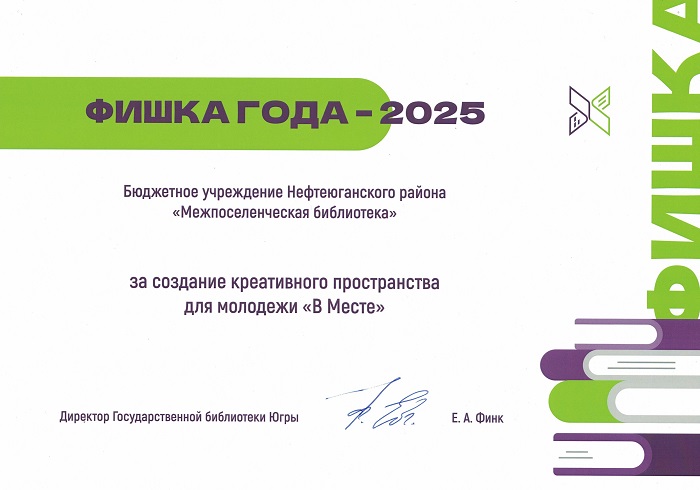 По итогам 2025 года «Фишку года» получила БУНР «Межпоселенческая библиотека» за реализацию уникального проекта - «Молодёжное креативное пространство "В Месте". Автором и вдохновителем проекта стала заведующая Пойковской поселенческой детской библиотекой «Радость» Руфина Фларидовна Имаметдинова.
