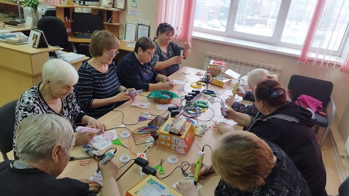 Продолжилось мероприятие в творческой мастерской. Участницы клуба познакомились с таким новым видом творчества, как создание картинок с помощью 3D ручки.