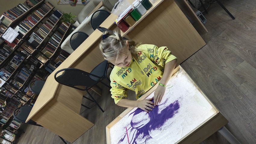 В Сентябрьской поселенческой библиотеке№1 у юных читателей есть много разных развлечений и занятий. Но мне хочется с вами поделится одним из самых любимым- это рисовать песком. Рисование песком отличается от классического рисования. Во-первых, у детей нет так называемого «страха белого листа», ведь лист изначально «грязный», да и даже если сделаешь не так, как хотел, все легко можно исправить. Во-вторых, в отличие от рисования на бумаге, тут не нужна резинка или запас чистой бумаги, чтоб исправить ошибку. Достаточно всего лишь разровнять песок — и можно начинать заново