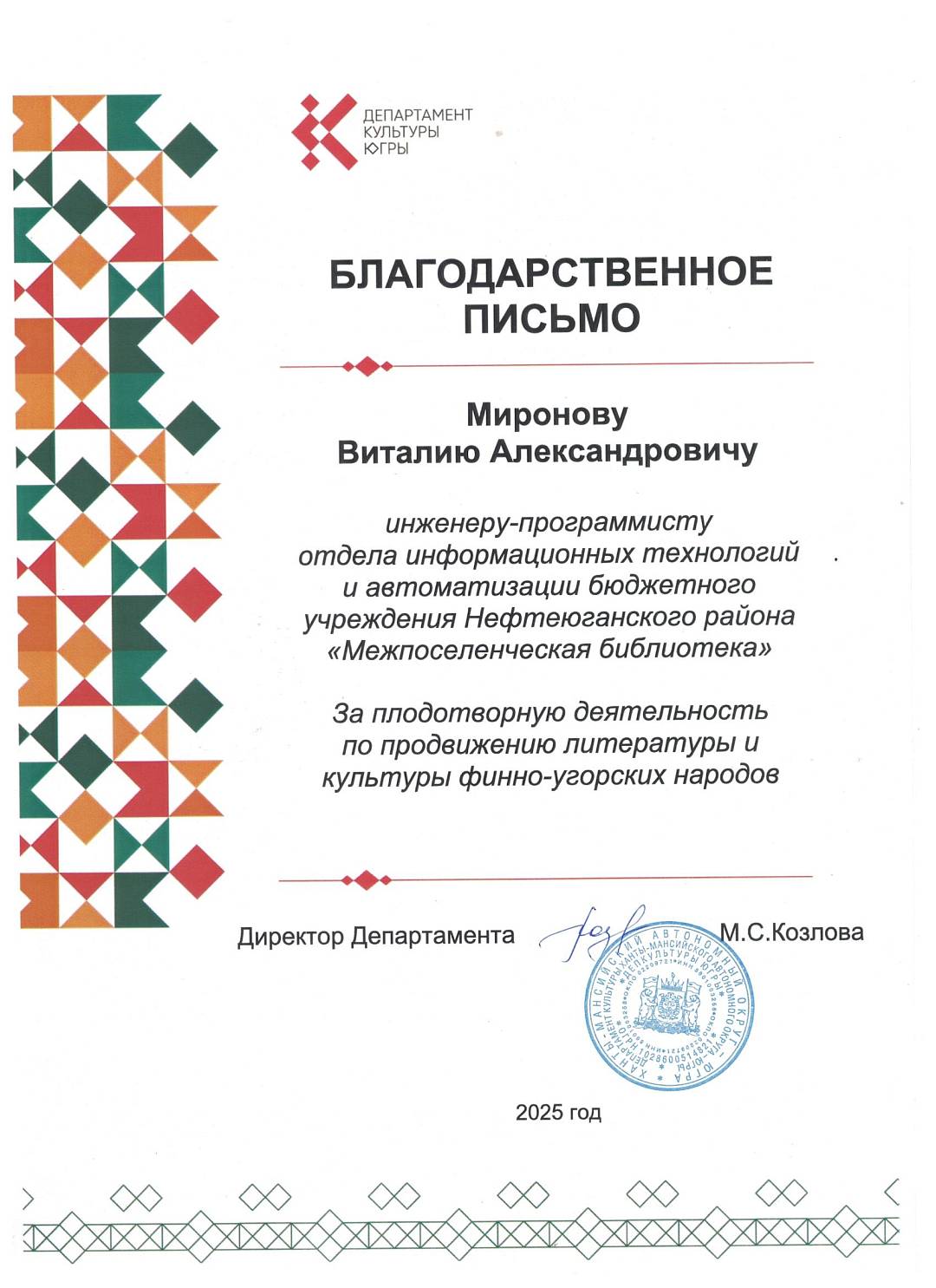За плодотворную деятельность по продвижению литературы и культуры финно-угорских народов Благодарственные письма от Департамента культуры Югры получили сотрудники Межпоселенческой библиотеки – Миронов Виталий Александрович инженер-программист, сотрудники отдела краеведения и проектной деятельности – Нестерова Ирина Ивановна и Кутарба Вероника Александровна.