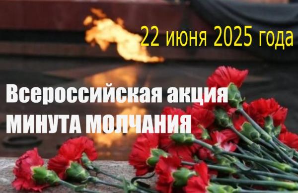 22 июня 2025 года в 14:15 час. по местному времени пройдет Всероссийская акция «Минута молчания», когда ОДНОВРЕМЕННО во всей России объявляется минута молчания, минута скорби, на одну минуту жизнь замирает: