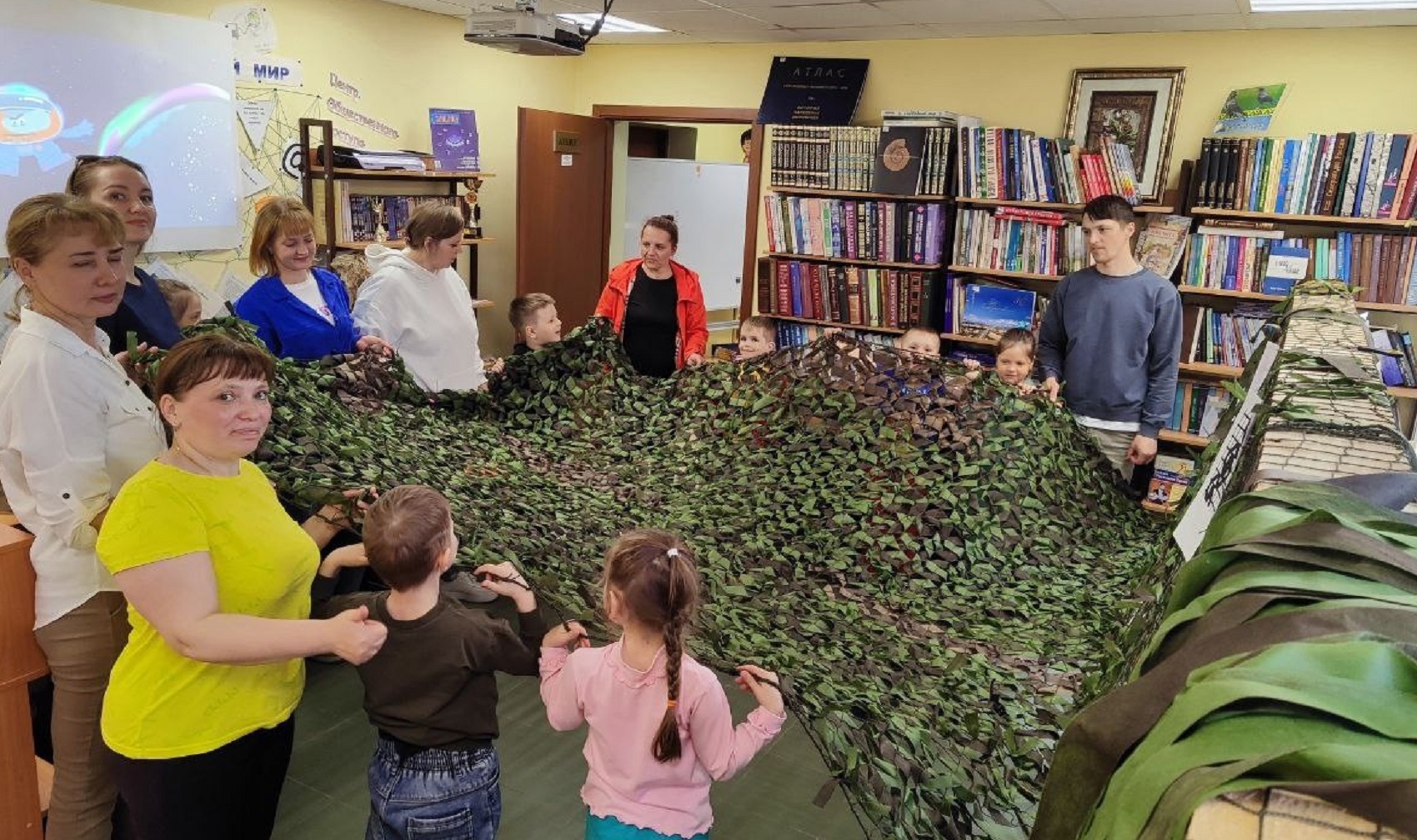 Юным гостям и их воспитателям, библиотекарь рассказала о важном и нужном деле, которое здесь выполняют. Дети увидели, как плетут маскировочные сети и внесли свою посильную лепту, также посмотрели, как нарезается лента для плетения. В конце мероприятия юные волонтёры решили проверить на себе, как работает маскировочная сеть.
